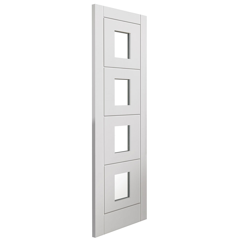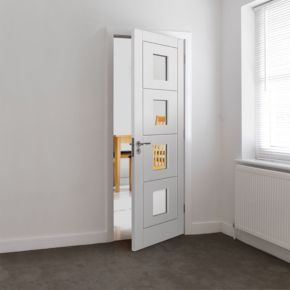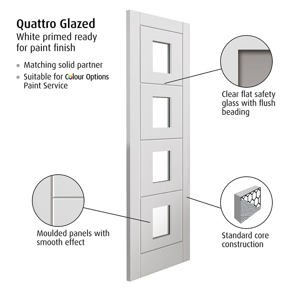 Features & Benefits: DISCON - JB Kind Quattro Moulded White Primed 4 Light Clear Glass Internal Door - 1981mm x 762mm (78 inch x 30 inch)