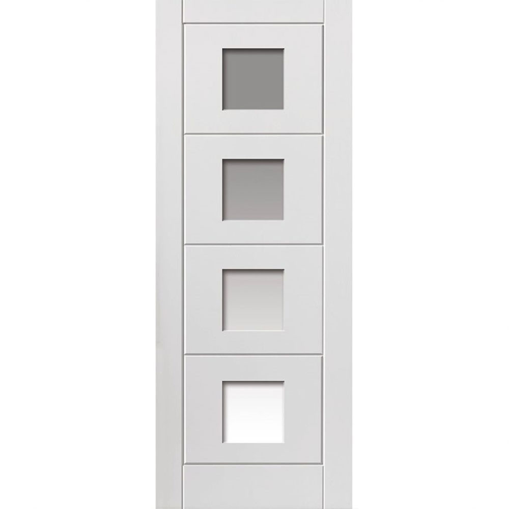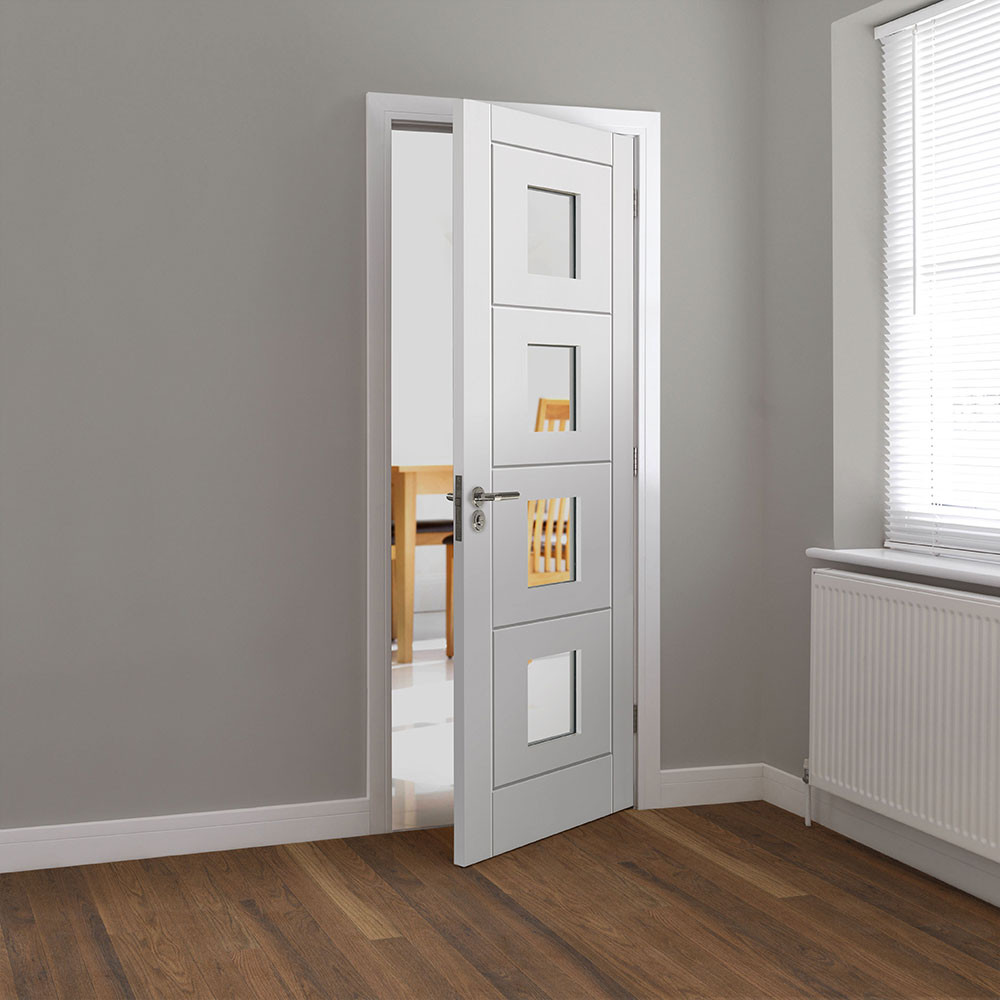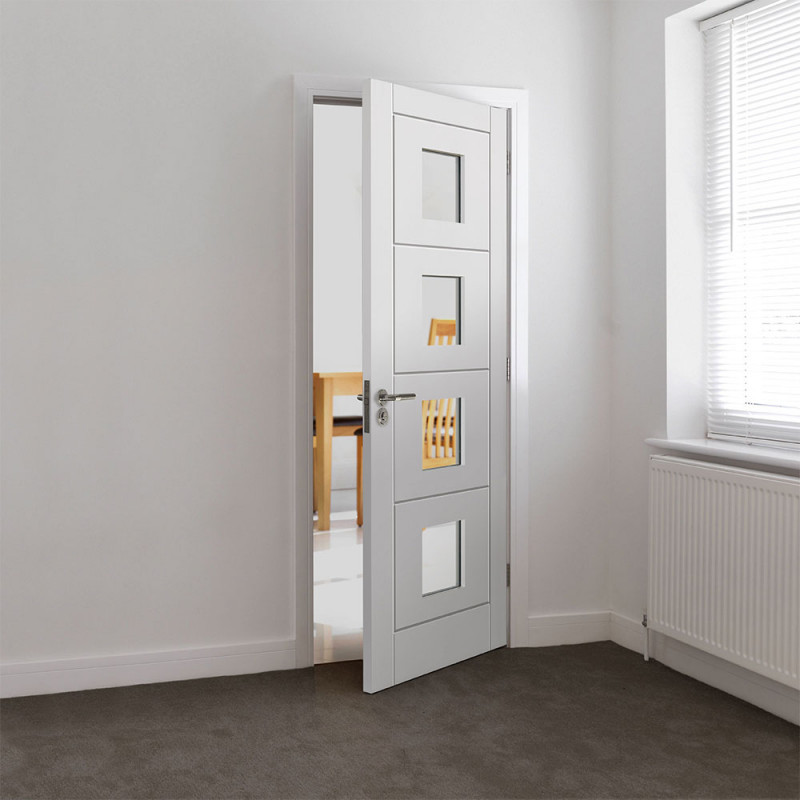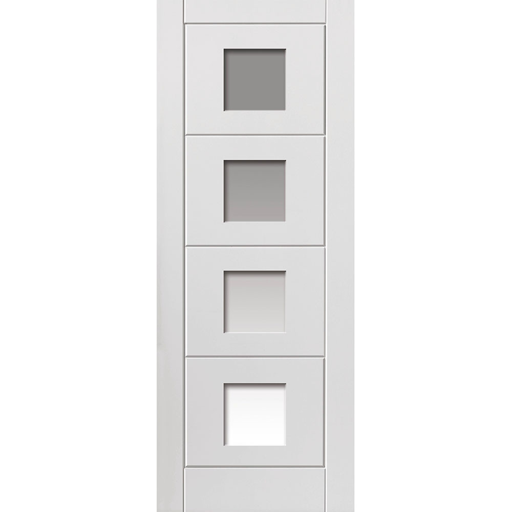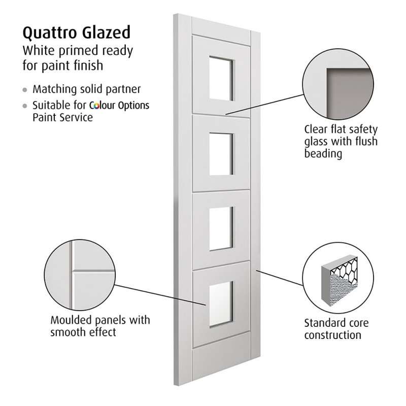 Features & Benefits: DISCON - JB Kind Quattro Moulded White Primed 4 Light Clear Glass Internal Door