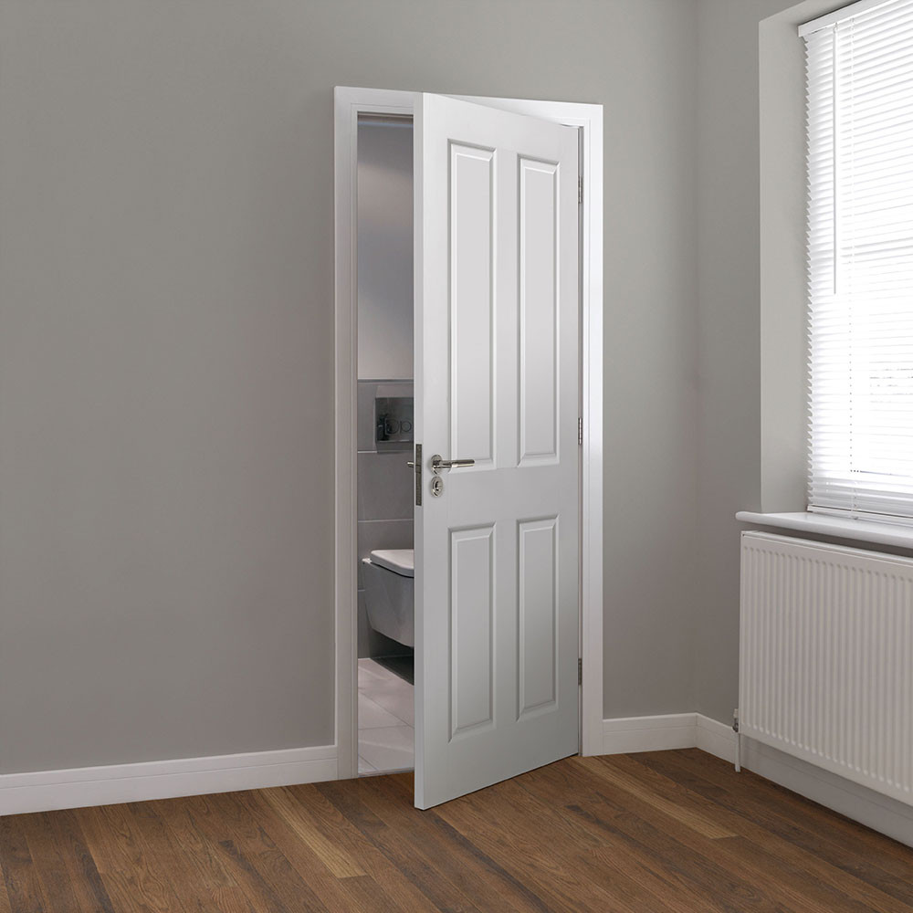 JB Kind's white moulded internal door collection includes some of the UKs most popular door designs, such as this, their traditional Canterbury. With four chic panels it looks warm and welcoming whether your home is traditional or modern. But what is meant by a moulded door? Moulded doors are made from a piece of fibreboard that's been put on a hot press to form a 'door skin' in the desired shape.