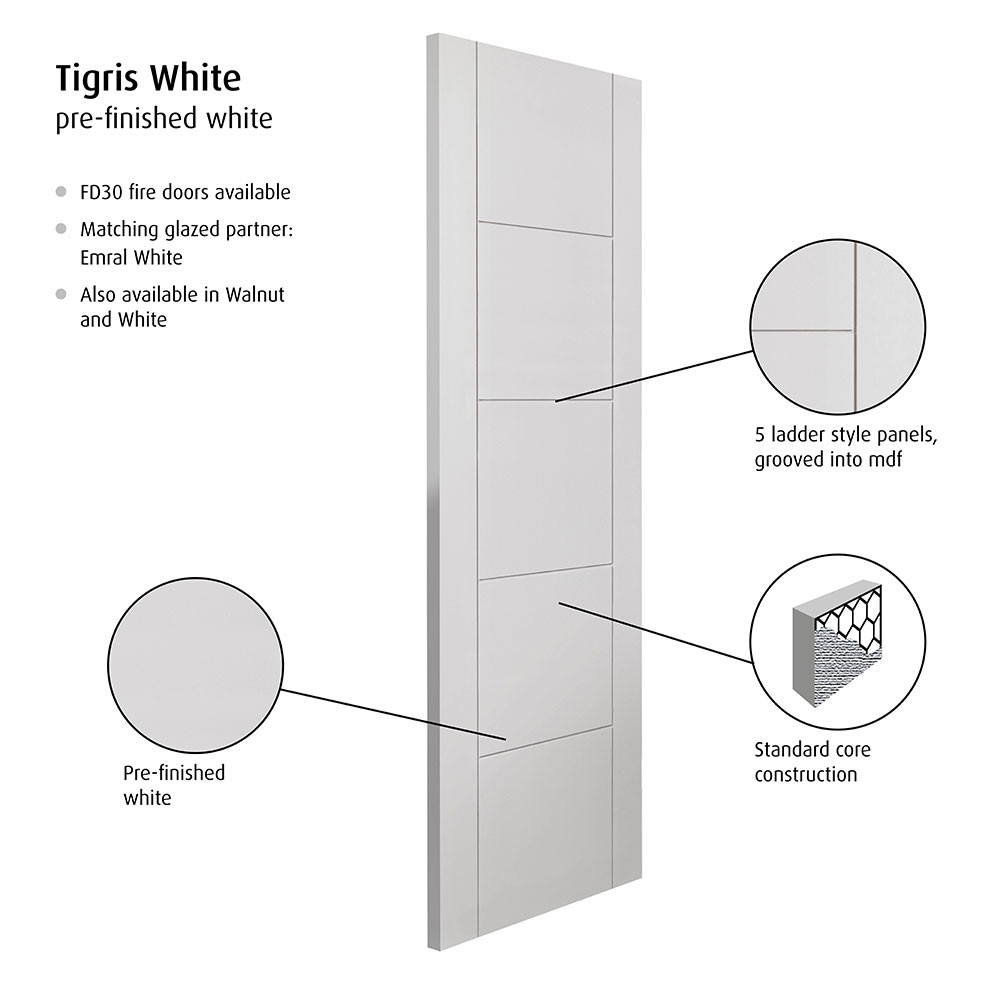 The Tigris features five sleek panels, grooved into the MDF in that on-trend ladder style. With its clean minimalist lines and streamlined flush style, it has a standard core construction. Even better, you don't have to do a thing to the Tigris once you get it home, apart from choose your handles and hang it up! Because it comes fully finished there's no painting or varnishing required. Just install to find the perfect partner in crime for your chosen theme.