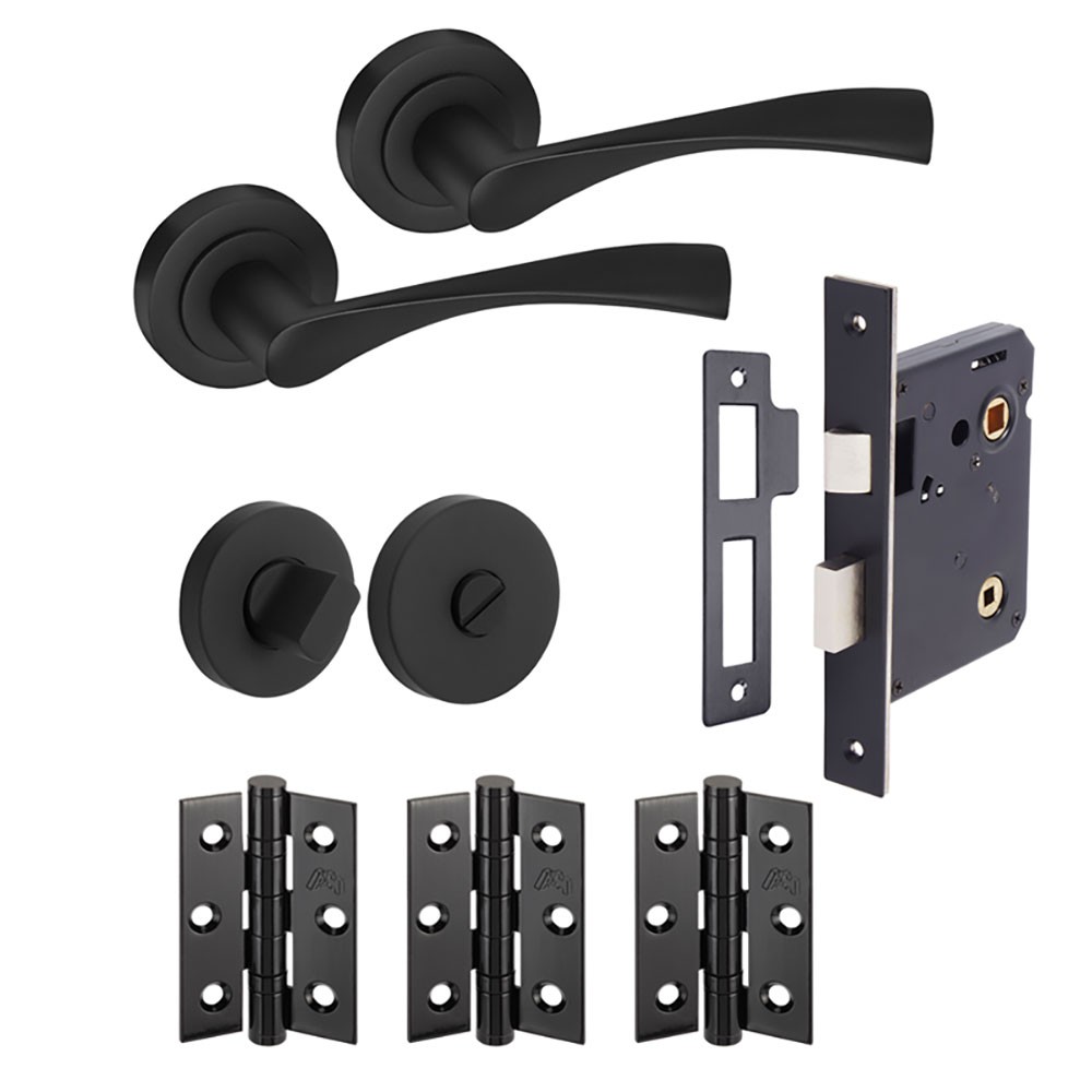 Add functional elegance to bathrooms and bedrooms with the JB Kind Matt Black Lever Handle and Fitting Accessories for Privacy Doors. With a sleek matt black finish, this complete privacy pack includes a pair of lever handles, a privacy latch, strike plate, bathroom turn and release, and three high-quality ball bearing hinges. It's the perfect solution for creating a seamless, stylish look across internal privacy doors.