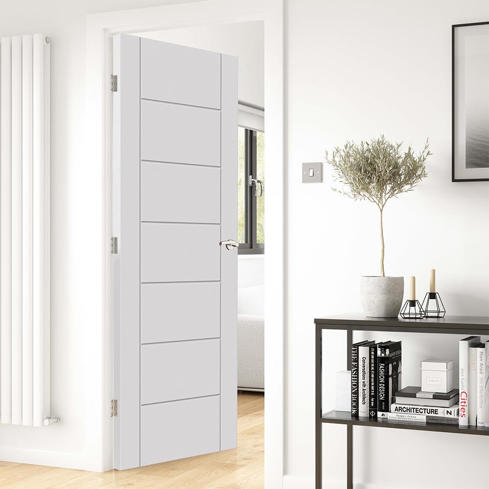 Give your interiors a fresh start with the JB Kind Palomino Contemporary White Primed Internal Door, a contemporary choice that's supplied ready for paint to suit any décor. Its striking 7-panel ladder design with clean, square-cut U-shaped grooves brings modern character and ... Read More