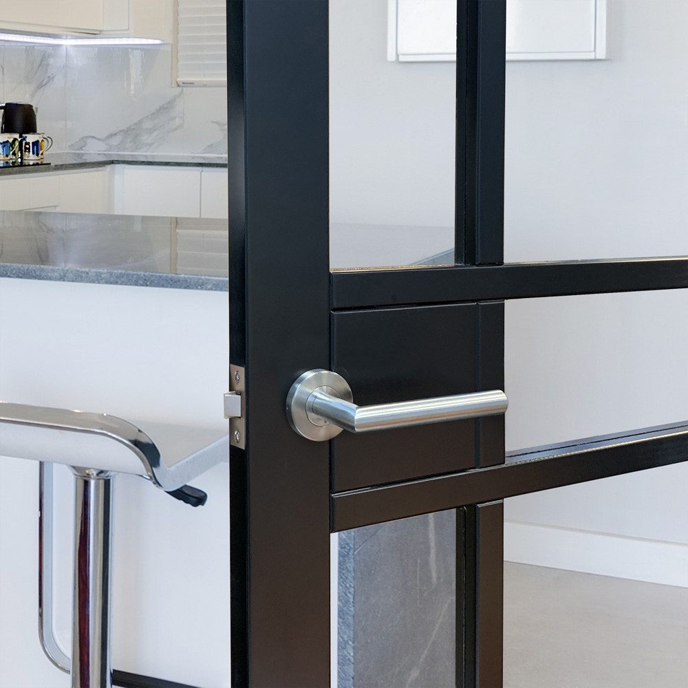 • Door handles feature a satin stainless steel finish that will complement various bathroom door designs