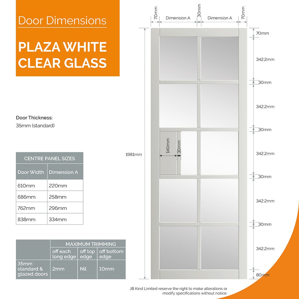 What's more, the solid construction and solid framing of the Plaza White with Clear Glass boasts help improve durability. So, the door will last longer, while the lock block will provide an additional layer of security. This fully finished white internal door has a 10mm bottom trimming tolerance and a 2mm sides trimming tolerance. It also comes in four different sizes, which makes it an excellent choice for different doorways and gives you considerable flexibility when you're hanging it.
