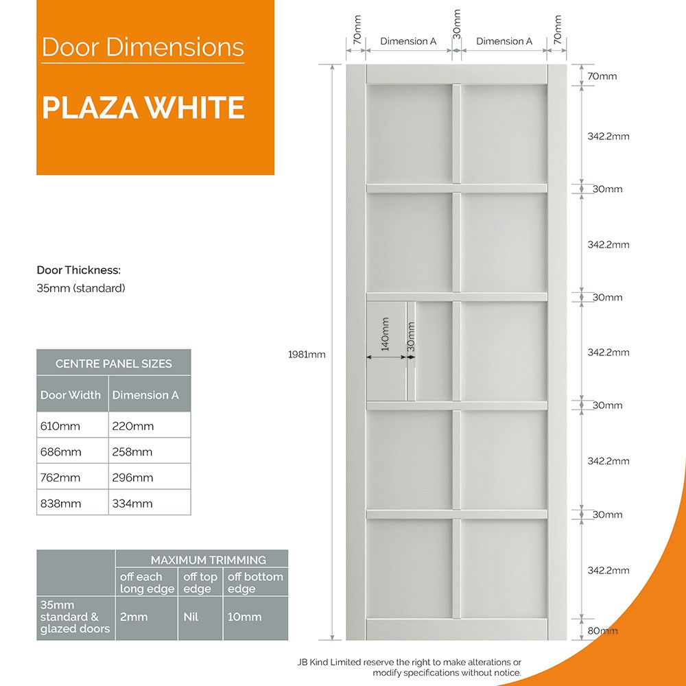 And the benefits don't end there. This fully finished white internal door has solid framing and lock block for additional security. The Plaza White is available in 4 sizes - and with a 10mm bottom trimming tolerance and 2mm sides trimming tolerance, it's a flexible choice for all sorts of interior spaces. A trendy and stylish yet solid and durable door, the Plaza Urban Industrial White by JB Kind can be a great match for pretty much any décor theme.