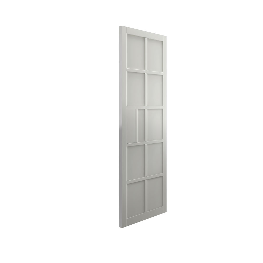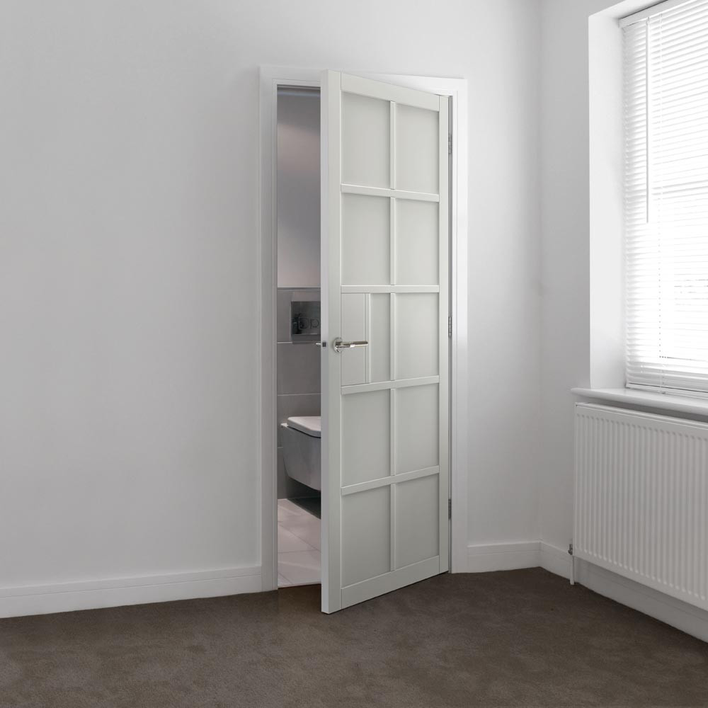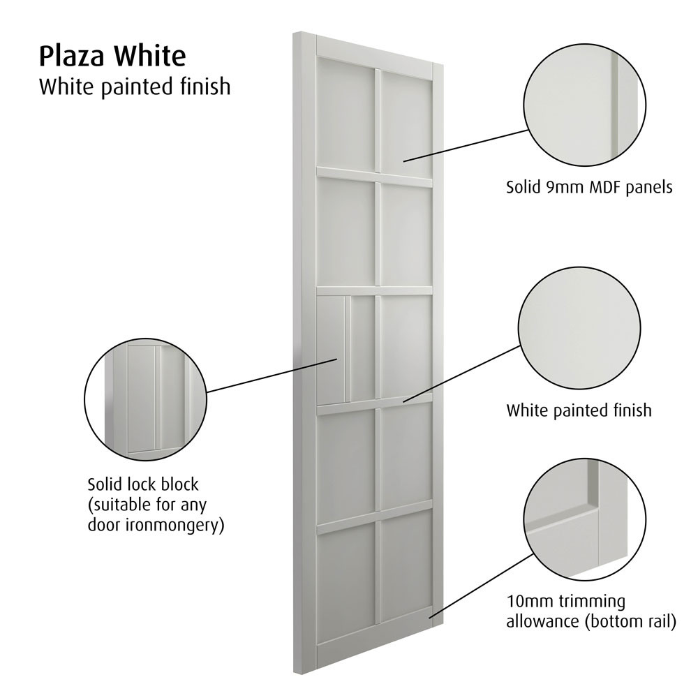 Are you looking for a panel door with a twist? The Plaza Urban Industrial White by JB Kind door with 10 industrial style 9mm medium-density fibreboard (MDF) panels will make your doorways stand out thanks to its contemporary, industrial style. This white internal door with recessed panels is fully finished, which means you can hang it as soon as it's arrived, without the need for any additional treatment. Even more conveniently, you can fit it with regular door furniture.