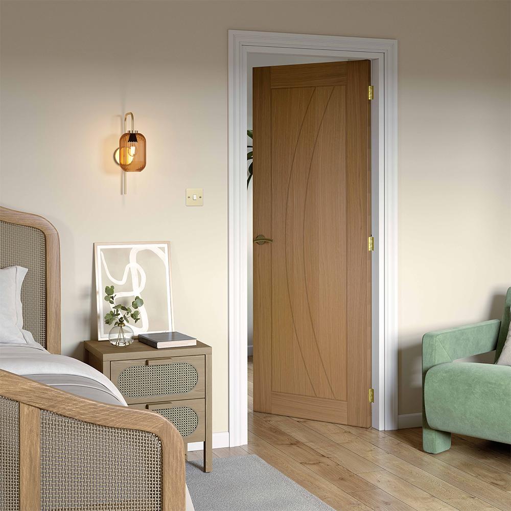 Introduce safety and sophistication to your home with this JB Kind Sicily Contemporary Fully Finished Oak Internal FD30 Fire Door, expertly finished in warm oak veneer and designed to meet FD30 fire-rated standards for up to 30 minutes of protection. Its contemporary curved groove detail brings a refined visual appeal to any interior while offering peace of mind where fire safety is essential.