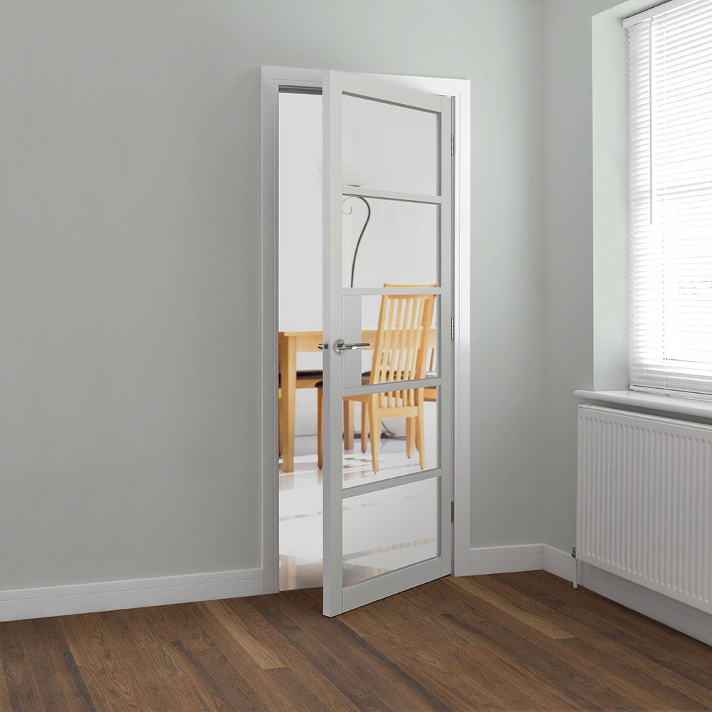 This internal door comes fully glazed with clear glazing. Clear glazing provides an unobscured view between rooms and allows ample natural light to pass through.