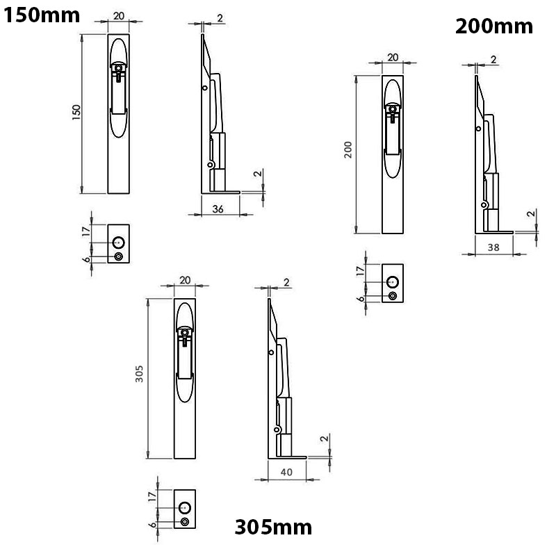 • Flush bolt available in 3 different sizes - 150mm, 200mm or 305mm