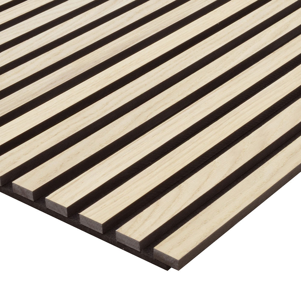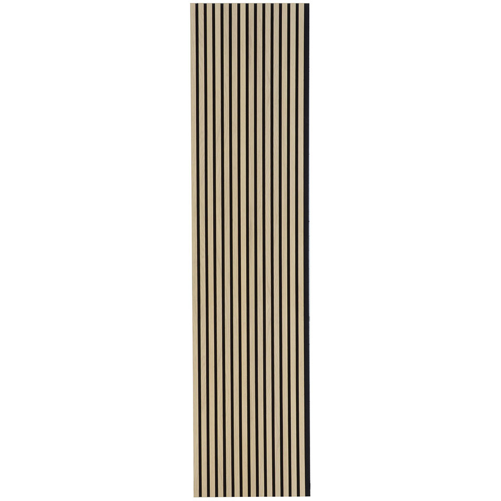 A great addition to rooms decorated with an on-trend contemporary style, this Kraus Refined Living Light Oak Acoustic Wall Panel will brighten spaces and complement neutral colour schemes. Each panel measures 573mm x 2400mm and covers 1.38m², effortlessly enhancing the ambience of any interior space. With its decorative MDF slats and acoustic felt backing, these panels add depth and texture to the walls in your hallway, living room, bedroom, and more, creating a subtle yet captivating visual effect.