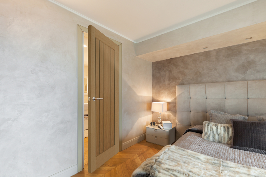 The laminated timber stiles are edged with a 10mm thick oak lipping and faced with white oak. The door panels have an MDF core and are faced with the same veneer. Beading is of solid White Oak.
