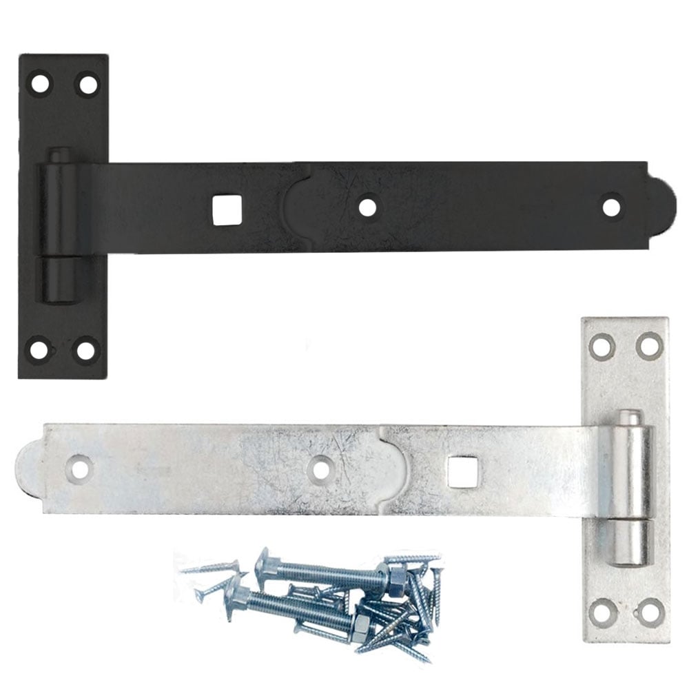 MATERIAL: SteelTYPE: Band and hook tee hingesFINISH: Galvanised or blackFIXINGS: Fixings includedDescription Heavy duty tee hinges. Includes a pair of hooks on backplate and straight bands, in a range of lengths. Traditional hinge comprising of a hook for ... Read More