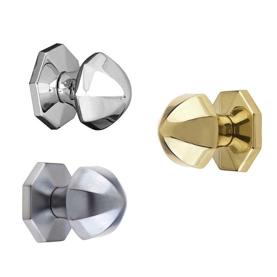 Material: Solid brass Type: Centre door knob pull Style: Decorative octagon pointed design Finish: Polished chrome, satin chrome and polished brass finishes available Fixings: Required fixings included These top quality centre door knobs are “pull knobs&rdq... Read More