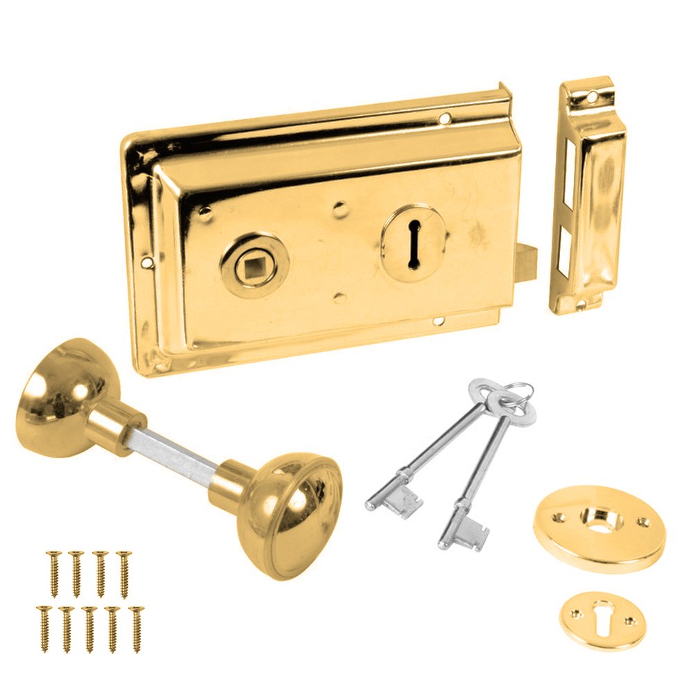 MATERIAL: BrassTYPE: Door knob handle setSTYLE: Rim lock with set of 2 keys and compatible knobsFINISH: Brass plated Lock Plastic Knobs & EscutcheonsFIXINGS: 9 x fixing wood screws, 2 keys, spindle and staple included Description PACK CONTAINS:1 x Pai... Read More