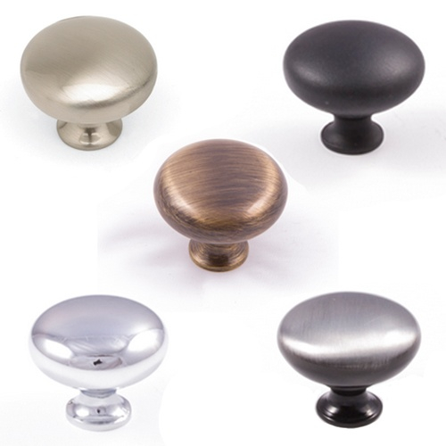 Cabinet and cupboard button style knob handles for use on a wide range of kitchen, office, bedroom or bathroom cabinet doors or drawers, available in 5 different finishes (Brushed Nickel, Black, Pewter, Chrome or Antique).