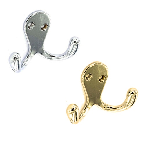MATERIAL: SteelTYPE: Traditional coat door hookSTYLE: Double hookFINISH: Chrome or Brass platedFIXINGS: 4 x 20mm x 3.5mm screws included (screw colour matches finish) Description 2 x Double coat and garment hooks, ideal for storing coats, towels, scarves and hats whilst taking... Read More