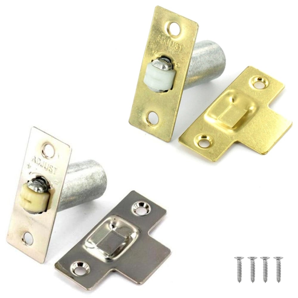 Adjustable roller bolt catch in choice of Polished Brass or Satin Nickel finish. Also includes matching face plate and keep.