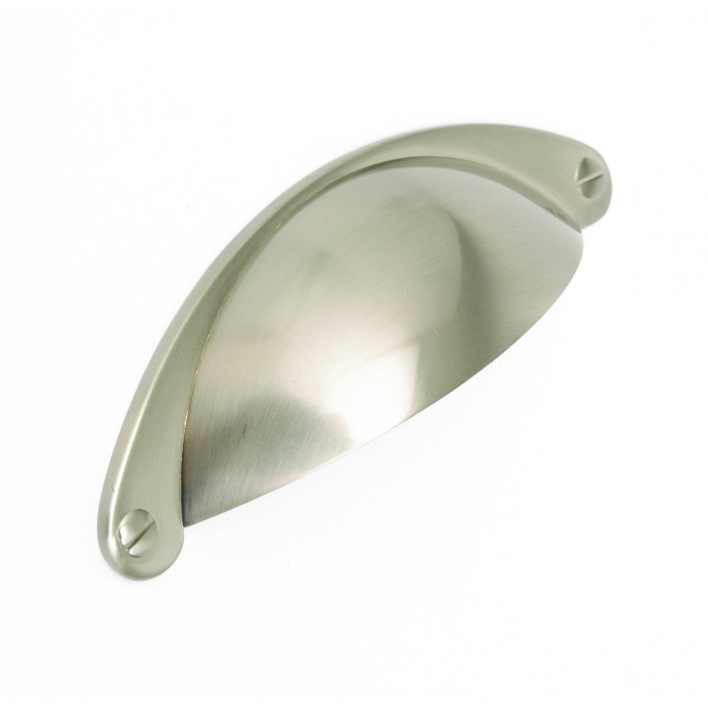 Kitchen cabinets satin nickel shaker cup pull handle for use on cupboards, cabinet doors and drawers.