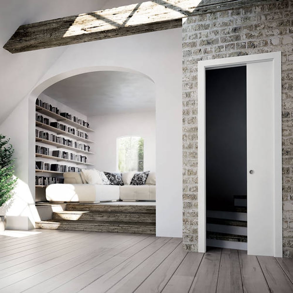 This Scrigno sliding door system utilises a pre-fabricated metal cassetee frame system to create a single pocket door. This modern system allows an internal door to slide into a pocket in the wall cavity, creating a contemporary feature point for your home as well as gaining vital extra space.