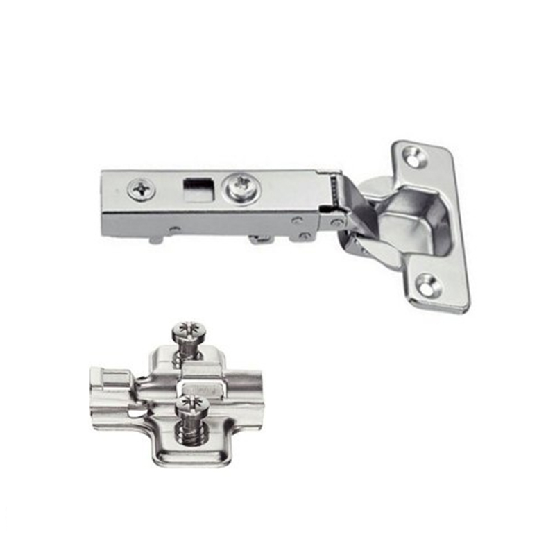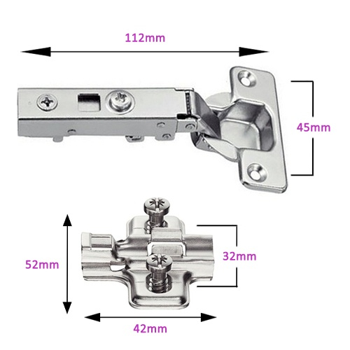 This hinge comes complete with a cruciform mounting plate and pre inserted euro screws for attaching to your cabinet and is designed for 18mm kitchen cabinets.