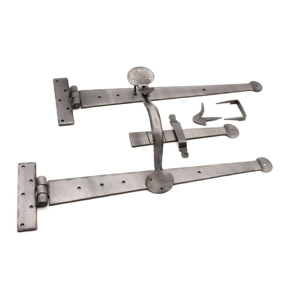 The Spira Brass Standard Penny End Handforged 18 inch Hardware Kit is a beautifully engineered cottage-style door hardware set, featuring hand forged iron strap hinges topped with classic penny-end detailing and a traditional Suffolk latch mechanism. Each component is individually forged and treated with a forge-blackened pewter finish, creating a soft, silvery patina that complements period interiors, barn conversions, and traditional ledge and brace doors.