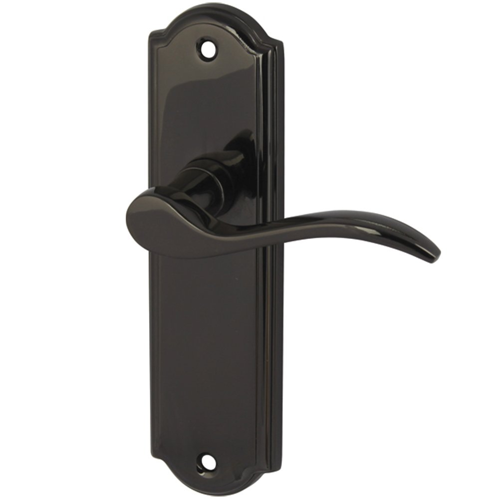 MATERIAL: Zinc AlloyTYPE: Lever on plate handle STYLE: Latch, lock or bathroomFINISH: Polished chrome, satin nickel or black iridiumFIXINGS: All fixing screws and spindle connector included Description   Pair of lever handles on plate availa... Read More