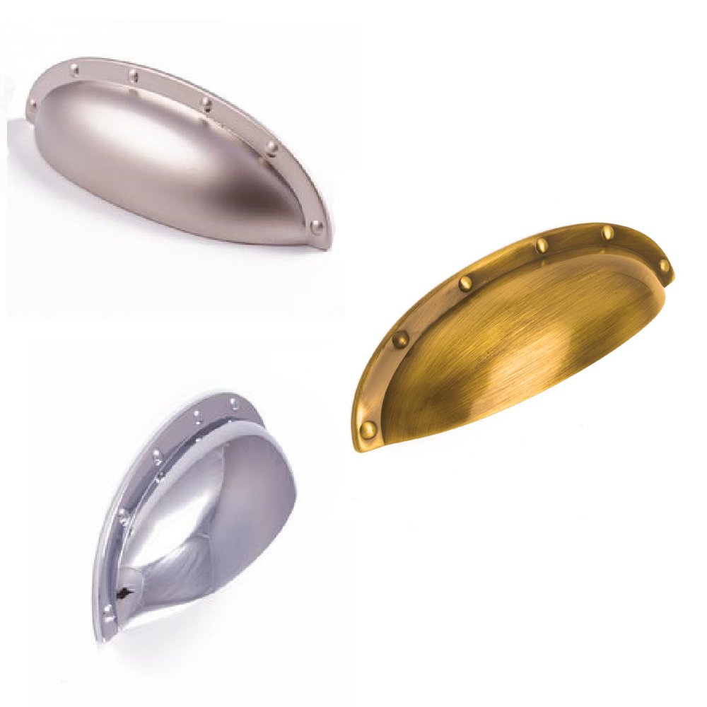 This traditional cup pull handle with decorative faux screw rivets is stylish and ideal for fitting to a wide range of cabinets, cupboards and drawers.