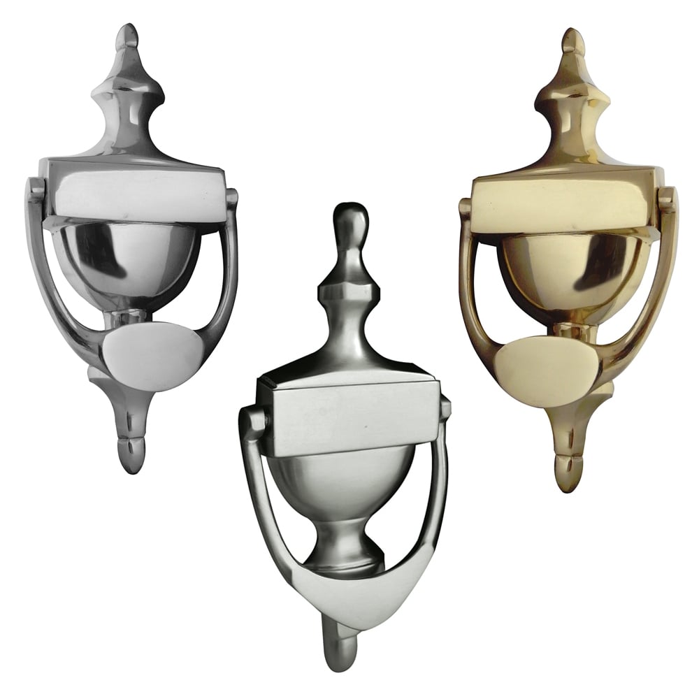 MATERIAL:Cast zinc alloyTYPE:Front door knockerSTYLE:Traditional 'urn' styleFINISH:Available in polished chrome, polished brass and satin chrome finishesFIXINGS:Supplied with the required bolts and nuts   Description   A traditional victorian design 'urn' style... Read More