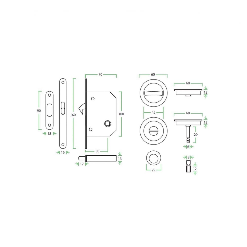 MATERIAL: BrassTYPE: Bathroom lock and sliding door kitSTYLE: Modern and flush design FINISH: Available in a polished chrome, polished brass, satin chrome and satin nickelFIXINGS: All required fixings includedDescription  COMPLETE KIT INCLUDES:  1... Read More